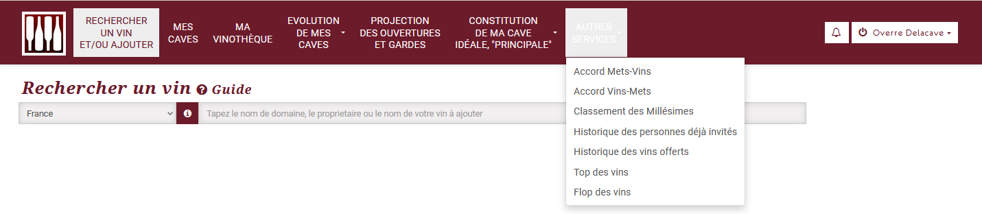 2 grands services distincts « Ma vinothèque et Mes caves » avec leurs modules communs pour