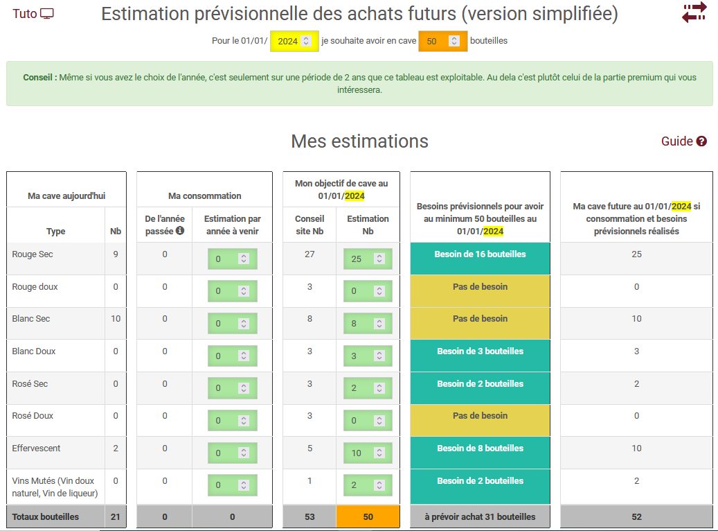 Basez vous sur les consommations moyennes des années passées (attendre au moins 1 an pour avoir la première consommation annuelle), et l'objectif de cave souhaité pour déterminer les besoins futurs. En version premium nous vous donnons la liste des vins en cave à consommer de préférence dans l'année en cours