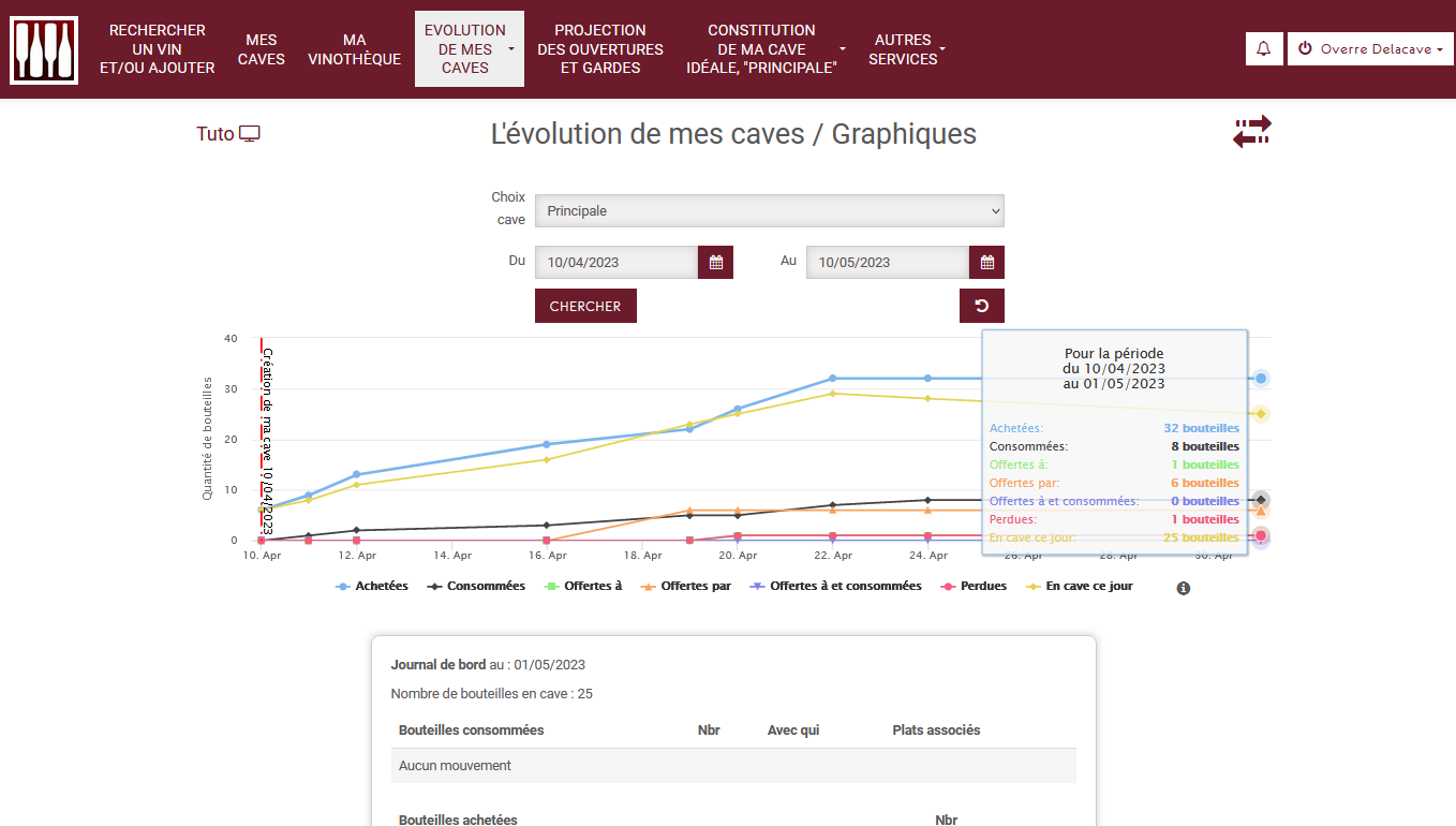 Par cave et par période, suivez tous les mouvements de votre cave. À chaque jour où il y a eu un mouvement, le journal de bord du jour vous indique les totaux des différents mouvements (achetés, consommés,…), le(s) vin(s) consommé(s) et/ou acheté(s).