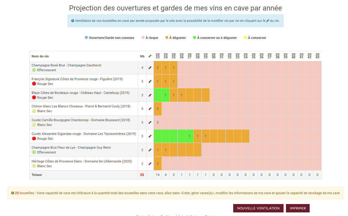 En Premium, nous vous proposons une ventilation par vin tenant compte de la qualité de votre cave, de la qualité des millésimes mais aussi les années d'ouverture et de garde de celui-ci. Ce n'est qu'une proposition que vous pouvez bien sur modifier à tout moment mais qui à l'avantage de vous donner une vision globale de votre cave dans le temps.