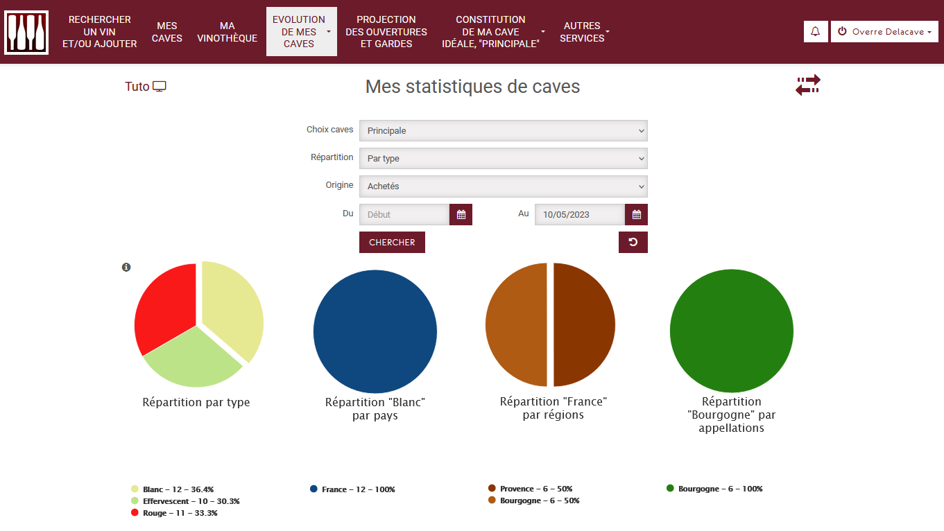 Le module Statistiques, vous permet d'analyser vos préférences en fonction de divers critères d'achat ou de consommation mais aussi de repérer les habitudes que l'on prend sans s'en rendre compte. (Choisir toujours la même région, le même type de vin en oubliant les autres vins)