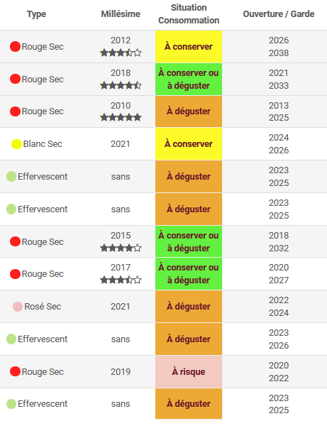 Lorsque le vigneron a rempli la fiche de son vin, les années d'ouverture et de garde vous sont notifiées si vous avez ce vin en cave.