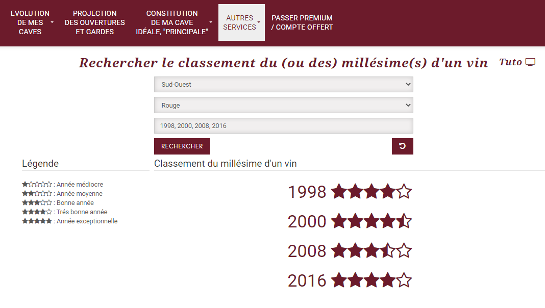 Avant un achat ou pour le choix d'ouvrir un vin, le comparateur de millésimes est une aide bienvenue. Attention, la qualité d'une année, moyenne de la région viticole n'est qu'UN critère et non pas LE critère pour se décider, le plus important restant toujours la dégustation.