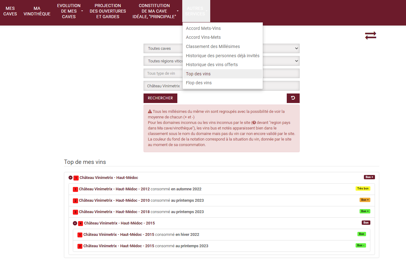 Ce service vous permet de classer vos vins dégustés de vos caves ou de la cave Vino en fonction des pays, des régions, des types de vins ou des domaines. Vous pouvez suivre particulièrement un vin d'un domaine et ainsi comparer votre notation de dégustation au fil des années.